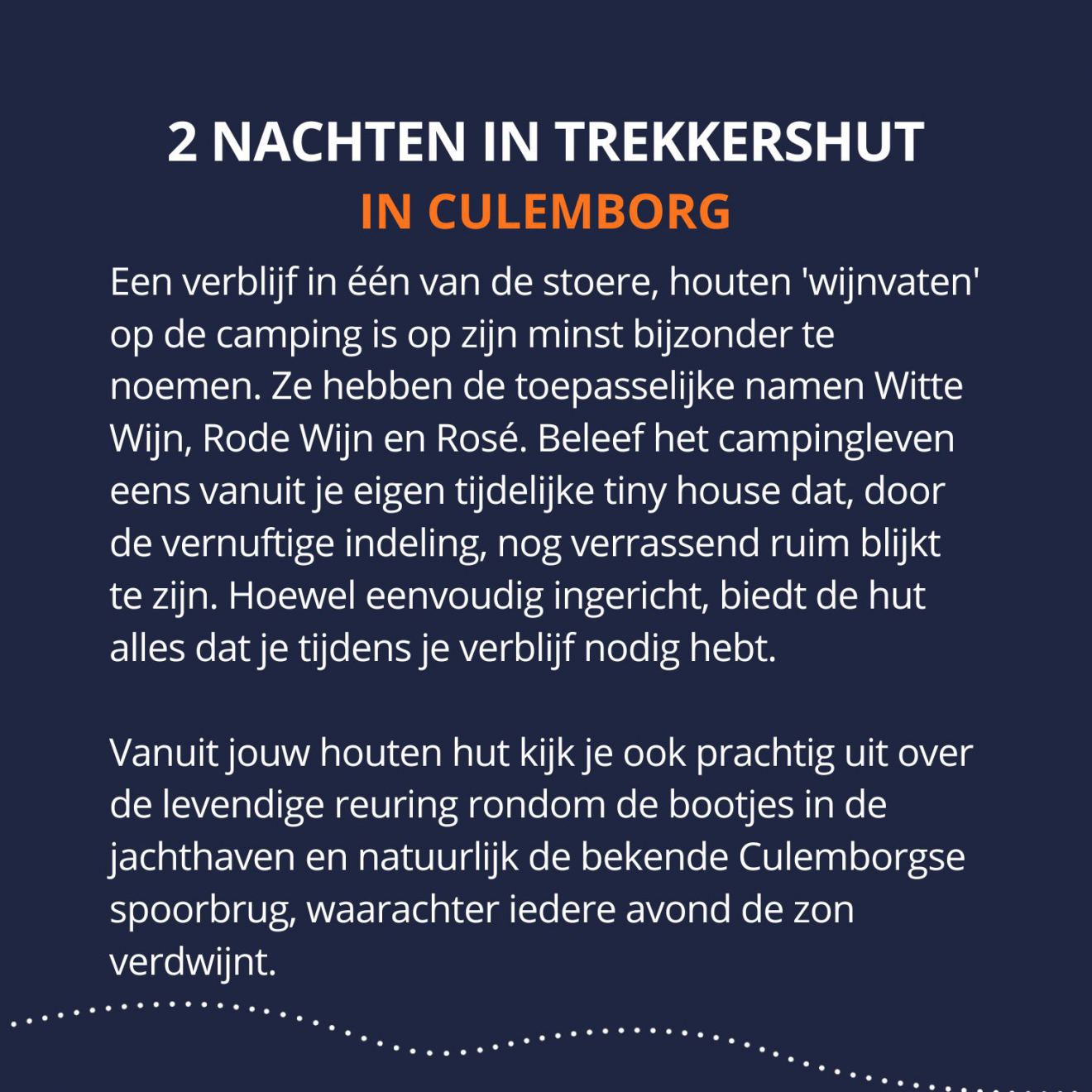 Een verblijf in één van de stoere, houten 'wijnvaten' op de camping is op zijn minst bijzonder te noemen. Ze hebben de toepasselijke namen Witte Wijn, Rode Wijn en Rosé. Beleef het campingleven eens vanuit je eigen tijdelijke tiny house dat, door de vernuftige indeling, nog verrassend ruim blijkt te zijn. Hoewel eenvoudig ingericht, biedt de hut alles dat je tijdens je verblijf nodig hebt. Vanuit jouw houten hut kijk je ook prachtig uit over de levendige reuring rondom de bootjes in de jachthaven en natuurlijk de bekende Culemborgse spoorbrug, waarachter iedere avond de zon verdwijnt.