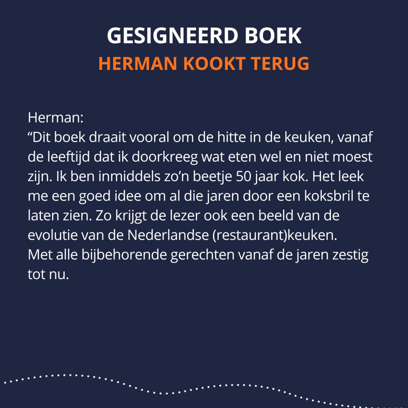 “Dit boek draait vooral om de hitte in de keuken, vanaf de leeftijd dat ik doorkreeg wat eten wel en niet moest zijn. Ik ben inmiddels zo’n beetje 50 jaar kok. Het leek me een goed idee om al die jaren door een koksbril te laten zien. Zo krijgt de lezer ook een beeld van de evolutie van de Nederlandse (restaurant)keuken.