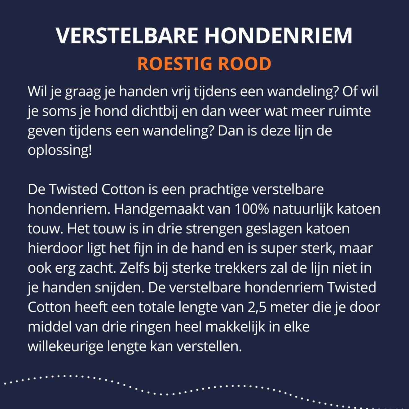 De Twisted Cotton is een prachtige verstelbare hondenriem. Handgemaakt van 100% natuurlijk katoen touw. Het touw is in drie strengen geslagen katoen hierdoor ligt het fijn in de hand en is super sterk, maar ook erg zacht. Zelfs bij sterke trekkers zal de lijn niet in je handen snijden. De verstelbare hondenriem Twisted Cotton heeft een totale lengte van 2,5 meter die je door middel van drie ringen heel makkelijk in elke willekeurige lengte kan verstellen. Ideaal als trainingslijn voor de hond, aangezien je altijd een perfecte lengte kan vinden.